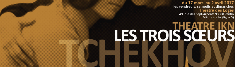 « Les trois soeurs », le chef-d’oeuvre d’Anton Tchekhov sera présenté par la troupe au magnifique Théâtre des Loges à Pantin (M° Hoche) du 17 mars au 2 avril 2017, tous les vendredis, samedis et dimanches, dans une mise en scène de Samy Cohen avec dans les rôles titre : Claire Bisiau, Annabelle Bralet et Agathe Garnier-Frison. Elles seront accompagnées de Jocelyne Abitbol, Laure Bienvenu, Marie-France Chedru, Dominic Billault (qui fait son grand retour après des années d’absence), Samy Cohen, Aymeric Dubief, Hama, Serge Housty, Nicolas Laurent, Charles-Eric Le Dentu, François Moreau et Benoît Plane.